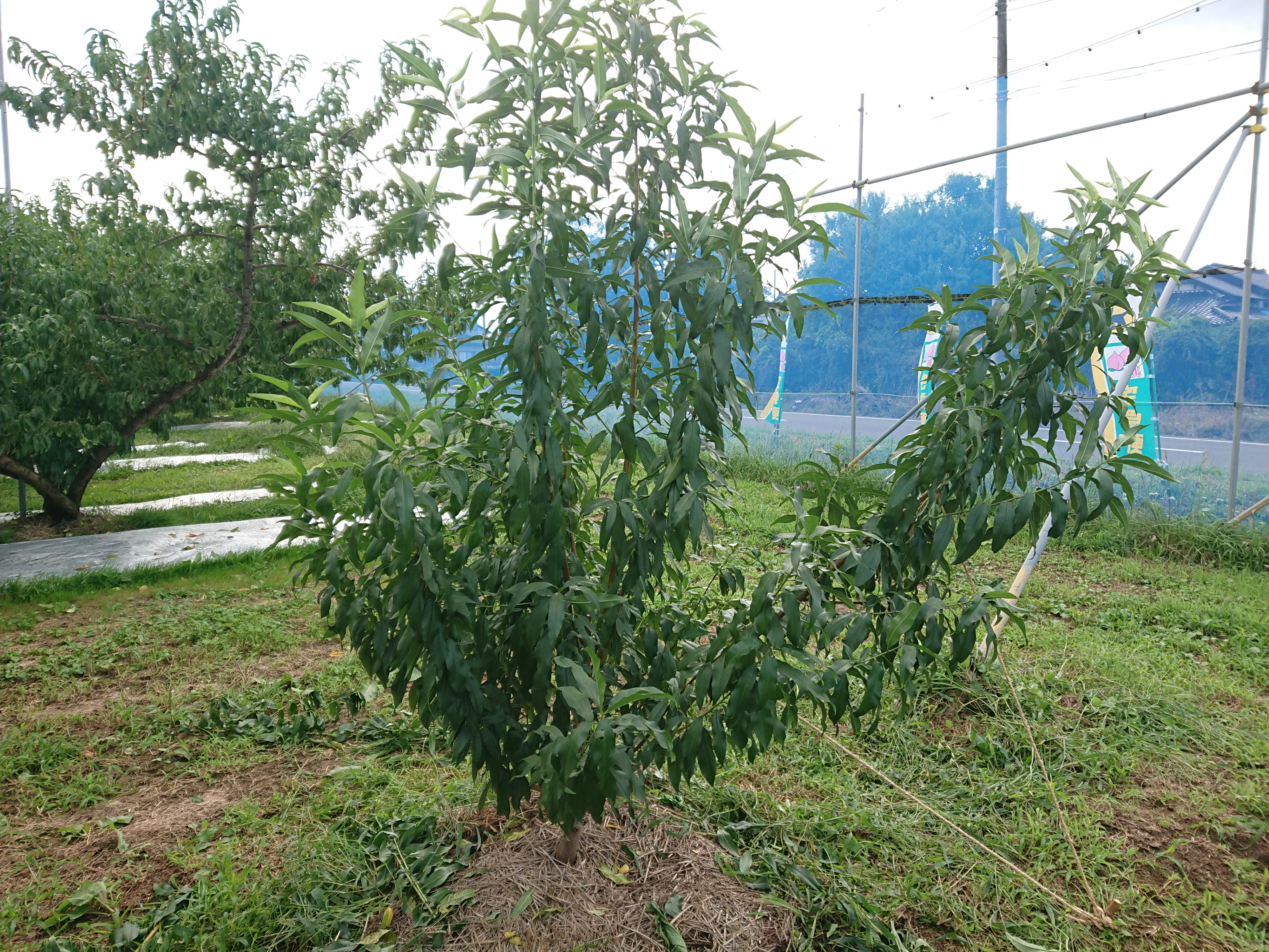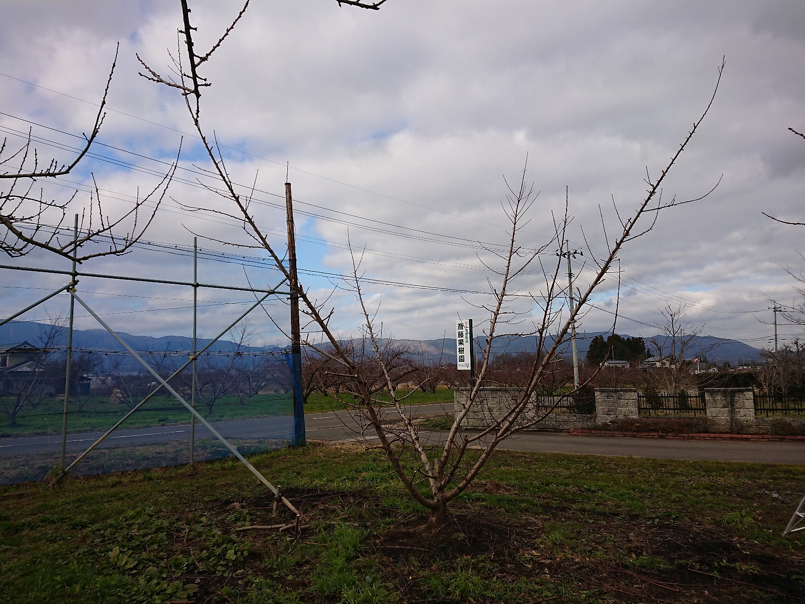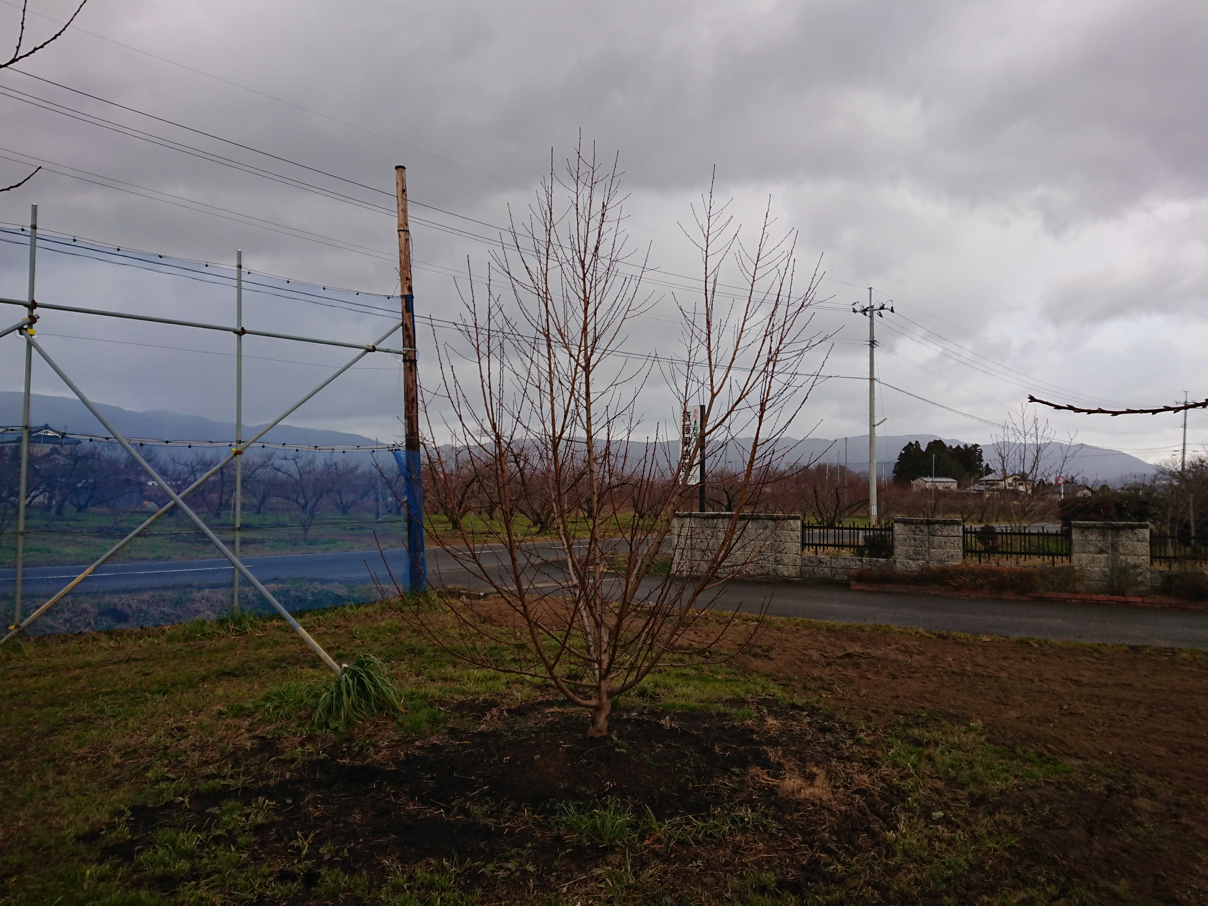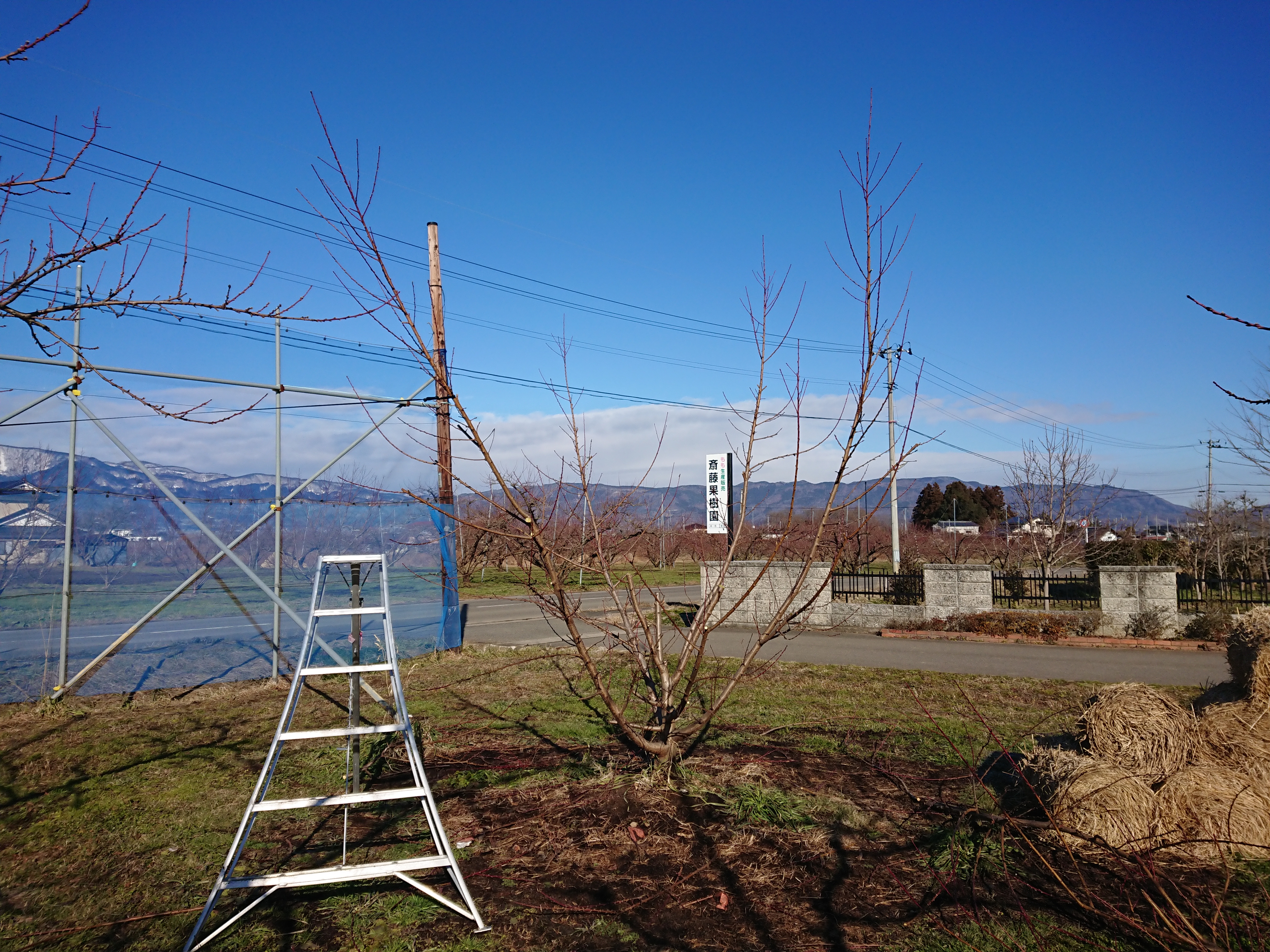 春先に50年に一度レベルの大凍霜害が発生し、今までに経験したことのない大きな被害を受けました。この木も満開時の霜で雌しべが焼けてしまい、300個ほど実を着ける予定が、最終着果数が10個程度になってしまいました。そのため、木が暴れてしまい予定していた樹形になりませんでした。(2021年12月下旬撮影)